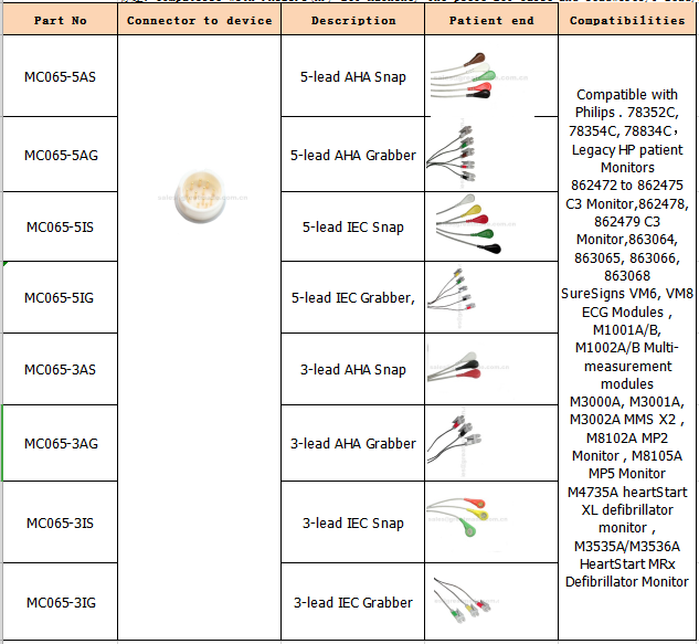 „Kompatybilny z Philips. 78352C, 78354C, 78834C”, starsze monitory HP HP 862472 do 862475 C3 Monitor, 862478, 862479 C3 Monitor, 863064, 863065, 863066, 863068 SureSigns VM6, VM8 Moduły EKG, M1001A / B, M1002A / B Multi- moduły pomiarowe M3000A, M3001A, M3002A MMS X2, M8102A Monitor MP2, M8105A Monitor MP5 M4735A Monitor defibrylatora heartStart XL, M3535A / M3536A Monitor defibrylatora HeartStart MRx ”